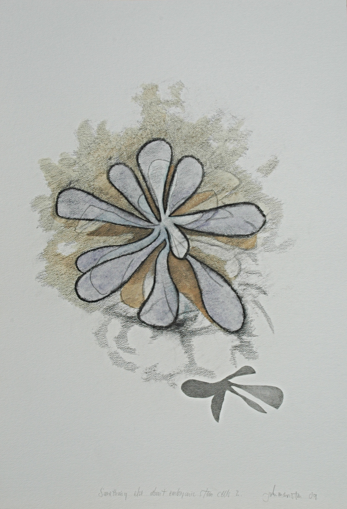 The first slide represents a single cell, not drawn from an actual cell, but from a succulent house plant. The drawing was modified to suggest a dancing cell, as a metaphor for its context, that is, what possibly could be. Then, the thought occured if cells can dance they must like music, so the sound of a cell became a conscious interest. These early drawings and paintings lead to many others. I later discovered there were even experiments in medical science which could locate and sonically attack certain cells without harm to its surrounding environment. Science and art shares so much. Towards the end of this series ‘my meandering malignant melanoma’ returned. My thoughts also changed and my work began to focus upon medical interventions, operations and scans. The heat of the experience can be seen in the latter works. A number of examinations followed leading to the discovery of further cancer cells in lymphatic glands and the lungs. A decision had to be made concerning possible chemotherapy and/or radium treatment. I decided to refuse both as I felt well and still energetic. However, I did declare an interest in the current research concerning immunotherapy, but at that time this was not available.